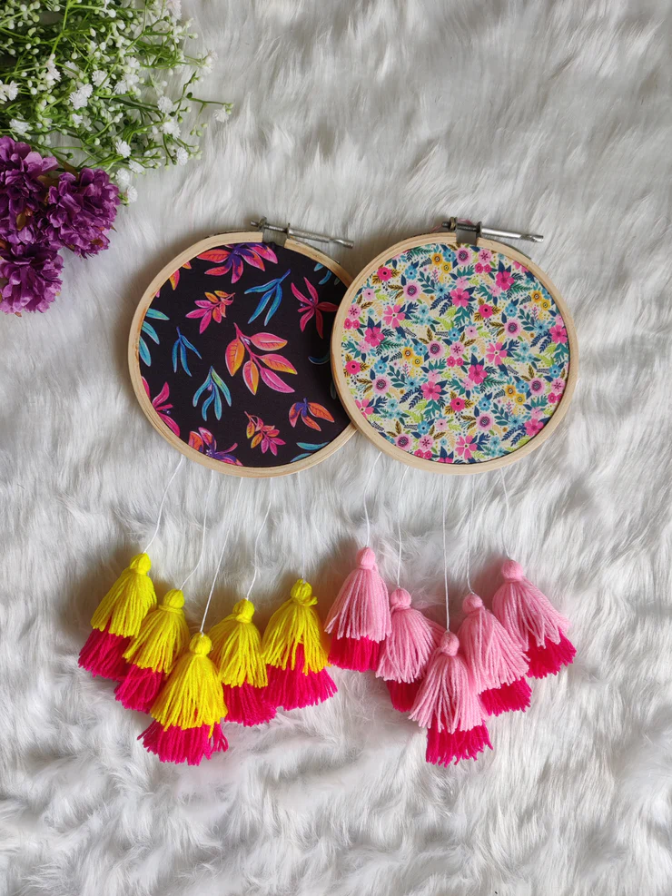This quirky (set of 2) dream catchers with floral prints on it is just what you need to uplift your home décor. The fluffy shade of yellow & pink tassels hanging on them blend beautifully with any ambience and adds to the charm of the dream catcher.