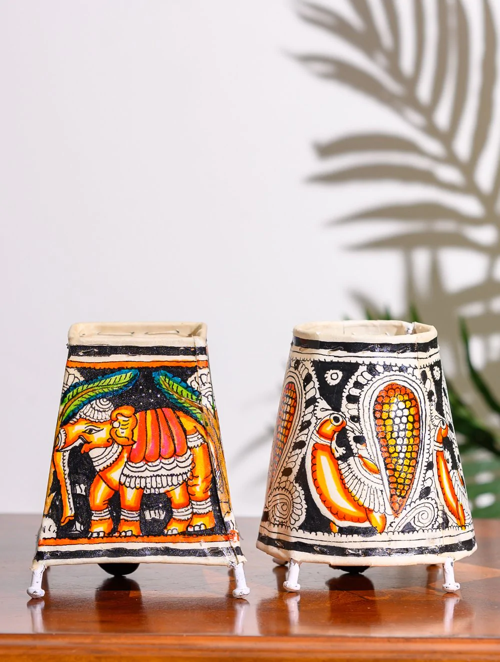 Andhra Leather Craft Lamp Shade, Small (6″ x 4″ / Set of 2) – Black Fauna. (Electrical fittings not included). The craft technique behind this beautiful translucent leather painted lamp shade from Andhra Pradesh is an offshoot of the traditional and popular shadow-puppet theatre tradition – ‘Tholu Bommalata’ – literally meaning ‘the dance of leather dolls.’ A vibrant and unique work of art to liven up a wall or corner!
